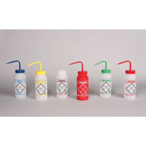 Wash Bottle, 500 ml, Translucent, LDPE, Assorted Cap, Polypropylene Cap Material, Wide Mouth, 53 mm Neck Size, Assortment Labeled, Safety-labeled, Easy-to-read Printed Bottles, Solvent-resistant, Easy Refilling