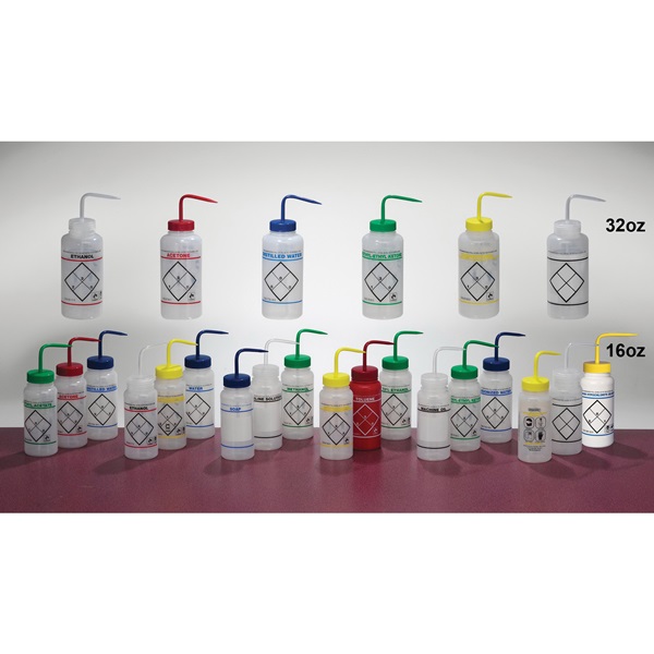 Bel-Art's safety labeled wash bottles include Department of Transportation (DOT) and National Fire Protection Association (NFPA) codes and symbols, Chemical Abstract Service (CAS) number, protective equipment symbols and target organ information, making your workplace a safer place.