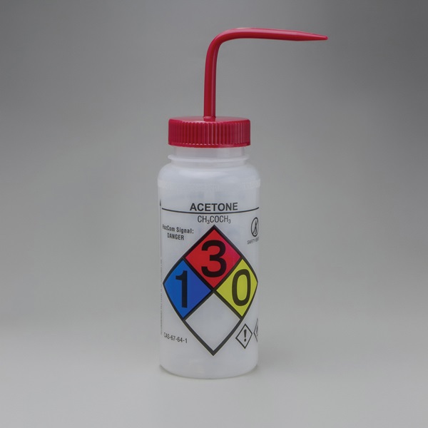 Wash Bottle, 500 ml, Translucent, LDPE, Red Cap, Polypropylene Cap Material, Wide Mouth, 53 mm Neck Size, Acetone Labeled, Pre-printed, Safety-vented, Color-coded, Valve Allows Dispensing of Wash Bottle in an Upright or Inverted Position