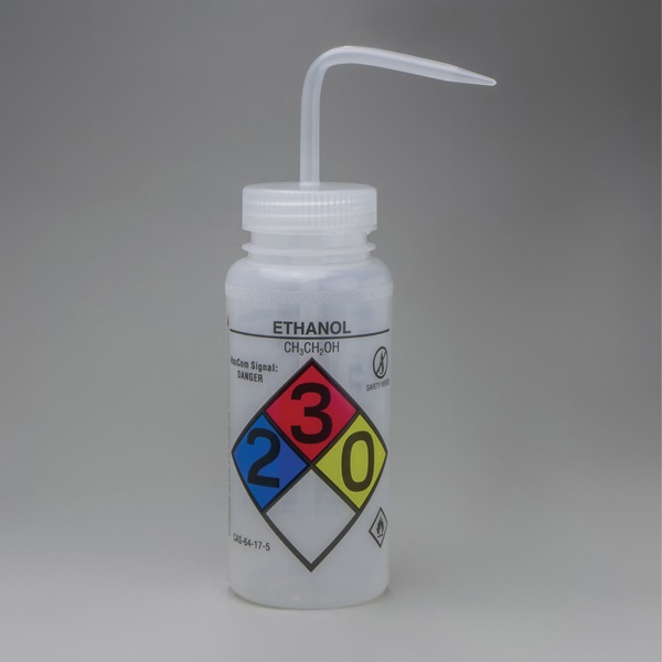 Wash Bottle, 500 ml, Translucent, LDPE, Natural Cap, Polypropylene Cap Material, Wide Mouth, 53 mm Neck Size, Ethanol Labeled, Pre-printed, Safety-vented, Color-coded, Valve Allows Dispensing of Wash Bottle in an Upright or Inverted Position