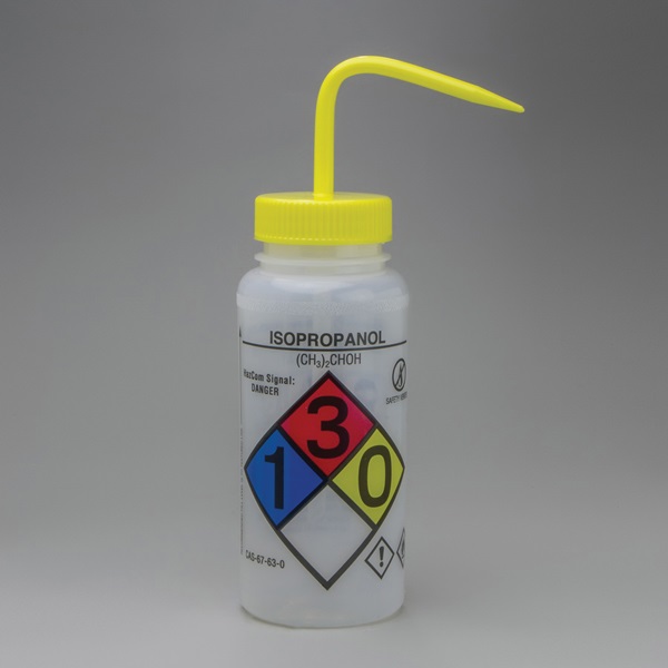 Wash Bottle, 500 ml, Translucent, LDPE, Yellow Cap, Polypropylene Cap Material, Wide Mouth, 53 mm Neck Size, Isopropanol Labeled, Pre-printed, Safety-vented, Color-coded, Valve Allows Dispensing of Wash Bottle in an Upright or Inverted Position