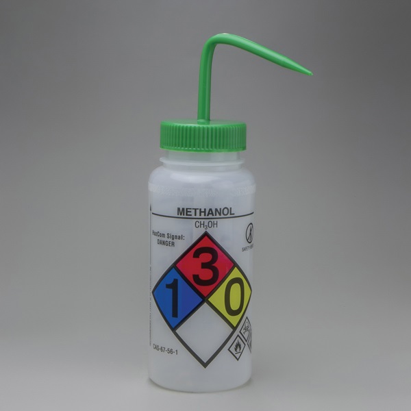 Wash Bottle, 500 ml, Translucent, LDPE, Green Cap, Polypropylene Cap Material, Wide Mouth, 53 mm Neck Size, Methanol Labeled, Pre-printed, Safety-vented, Color-coded, Valve Allows Dispensing of Wash Bottle in an Upright or Inverted Position