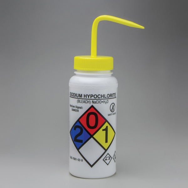 Wash Bottle, 500 ml, White, LDPE, Yellow Cap, Polypropylene Cap Material, Wide Mouth, 53 mm Neck Size, Sodium Hypochlorite Labeled, Pre-printed, Safety-vented, Color-coded, Valve Allows Dispensing of Wash Bottle in an Upright or Inverted Position