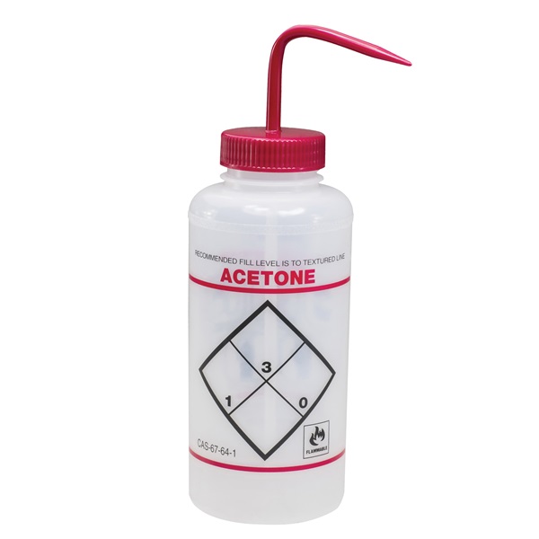 Wash Bottle, 1000 ml, Translucent, LDPE, Red Cap, Polypropylene Cap Material, Wide Mouth, 53 mm Neck Size, Acetone Labeled, Safety-labeled, Easy-to-read Printed Bottles, Solvent-resistant, Easy Refilling