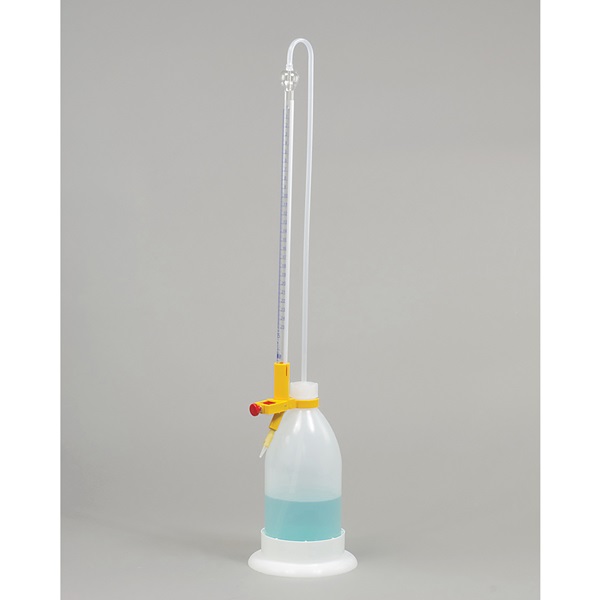 Automatic Glass Burette 25 ml, Blue Graduations Against a White Background, Glass, Graduated, 1000 ml Reservoir, 7.62 cm Bottle Diameter, 1/10 Divisions