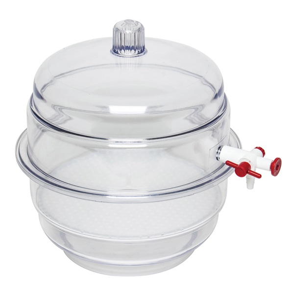Vacuum Desiccator, 0.20 cu ft, 19.7 ID x 26 cm H, 23 cm OD Flange, 19 cm dia Plate, 15.7 cm Clearance Above Plate, Clear, Polycarbonate Top and Bottom, Space Saver, Top Performance, Great Alternative to Heavy Glass Desiccators