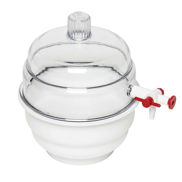Vacuum Desiccator, 0.09 cu ft, 14.9 ID x 20.6 cm H, 17.1 cm OD Flange, 14 cm dia Plate, 12.1 cm Clearance Above Plate, White, Polypropylene Bottom, Polycarbonate Top, Space Saver, Top Performance, Great Alternative to Heavy Glass Desiccators