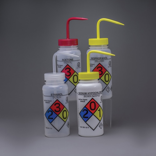 Safety-vented wash bottles provide compliance with the Globally Harmonized System of classification and labeling of Chemicals (GHS) and OSHA's HazCom 2012 requirements - as pertains to workplace labels. Pre-printed with the chemical name and formula, GHS pictogram and signal word, National Fire Protection Association (NFPA) Section 704 Four-color Diamond, health hazards, Chemical Abstract System (CAS) number, and suggested protective clothing and equipment.