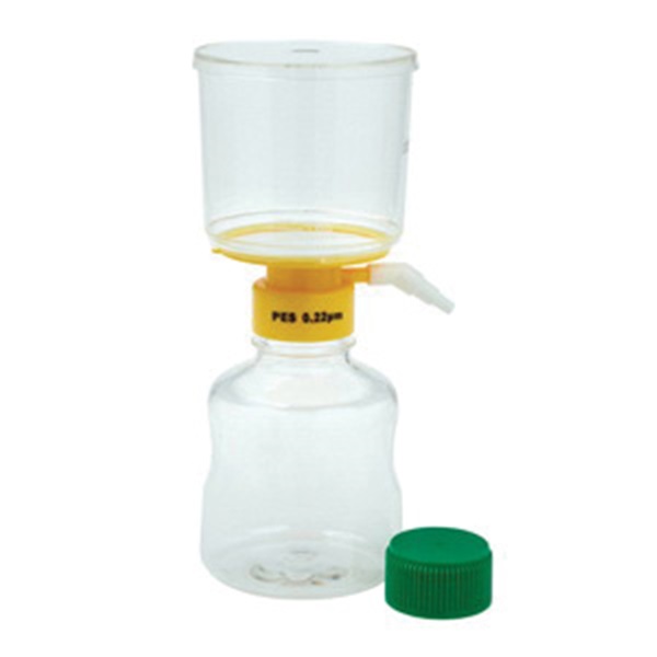 Filter System, 500 ml, Clear, Polypropylene, 0.22 µm Pore Size, Graduated, Green Cap, Sterile, without Tissue Culture Treated, Curved Bottle Design
