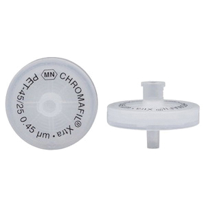 Disposable syringe filters Chromafil® are ready-to-use filtration units, which are filter elements incorporated in a polypropylene housing. Because every filter is only used once, contaminations are avoided. Syringe filters are used for filtration of suspended matter from liquid samples or gases. With Chromafil®, rapid purification and removal of particles is very simple: Just place the filter on the syringe, and you are ready for filtration. Special manipulations are not required. Contamination of sensitive instrumentation by solid impurities can be avoided, thus increasing lifetime of chromatographic columns and equipment.