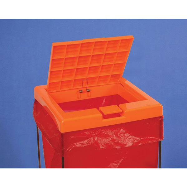 Keep bags open and securely supported on these economical, lightweight, stainless steel wire frames. Polypropylene bottom serves as a containment tray in the event of bag leakage and is safety orange in color for easy identification as a biohazard containment system.