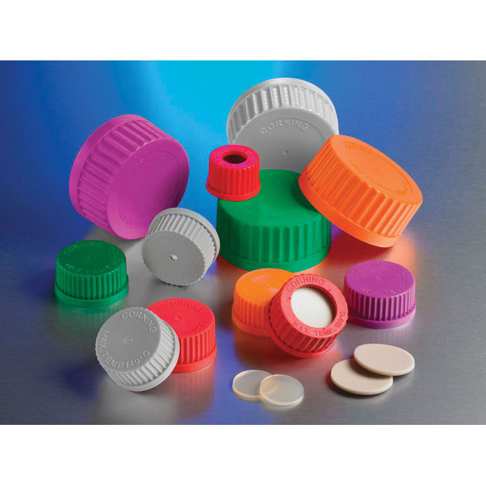 The red Corning polybutylene terephthalate (PBT) high temperature caps have a GL32 thread, can be dry heat sterilized at up to 180°C and have a polytetrafluorethylene (PTFE) liner for efficient sealing.