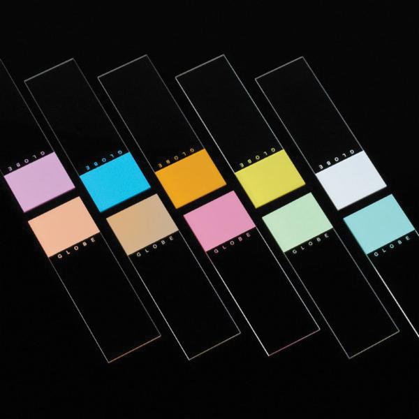 Diamond™ white glass color coded microscope slides are offered in bright, attractive colors. All are printed with "Globe" under the color area for orientation purposes. The slides are pre-cleaned and ready to use.