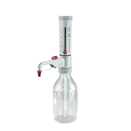 Bottletop Dispenser, 2.5 to 25 ml, Red, =±0.5% (125 µl) Accuracy, 0.5 ml Increment, =0.1% (25 µl) Imprecision (CV%), Analog Display, Adjustable, Autoclavable, Polypropylene Adapter, With Recirculation Valve