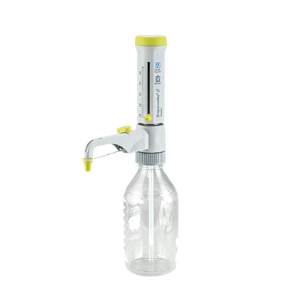 Organic Bottletop Dispenser, 2.5 to 25 ml, Yellow, =±0.5% (125 µl) Accuracy, 0.5 ml Increment, =0.1% (25 µl) Imprecision (CV%), Analog Display, Adjustable, Autoclavable, With Recirculation Valve