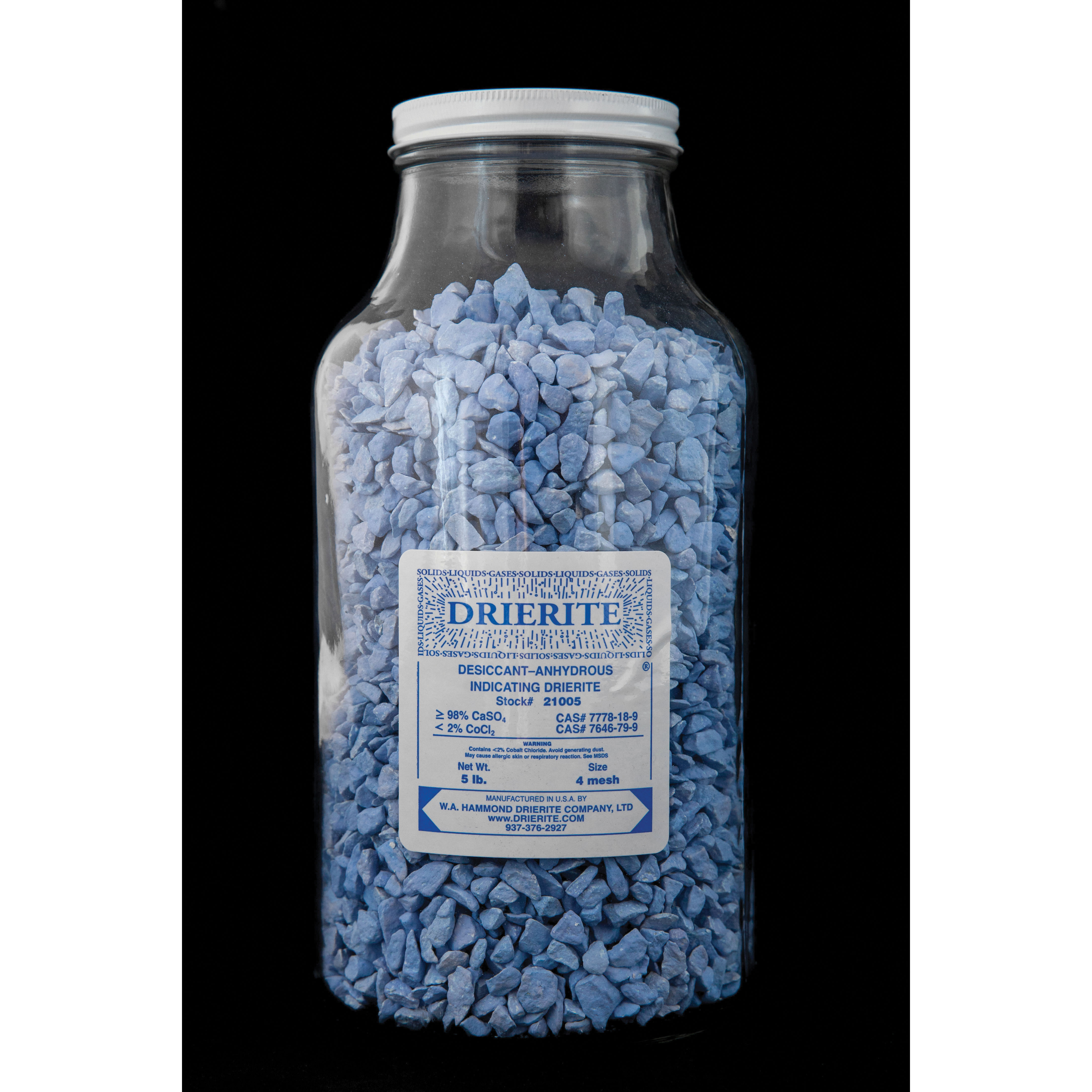 Drierite™ desiccants are made from the naturally occurring mineral, gypsum (calcium sulfate), and are available in several varieties designed to solve all types of drying problems. Drierite™ is an all purpose drying agent for the efficient and rapid drying of air, industrial gases, refrigerants, organic liquids and solids. It is used to maintain a dry atmosphere in storage spaces, vaults, commercial packages, and other enclosures; and for the protection of hygroscopic materials or materials subject to mildew, corrosion, rust, or other deterioration caused by high humidity. Indicating Drierite™ is impregnated with cobalt chloride. Indicating Drierite™ is blue when dry and changes to pink upon absorption of moisture. The color change is pronounced and clearly visible. This makes Indicating Drierite™ valuable when it is necessary to know with certainty that dryness is being maintained and to signal when the drying agent should be replaced. It has the same efficiency as Regular Drierite™, and somewhat greater capacity due to the desiccating effect of the cobalt chloride. It can be regenerated repeatedly for reuse.