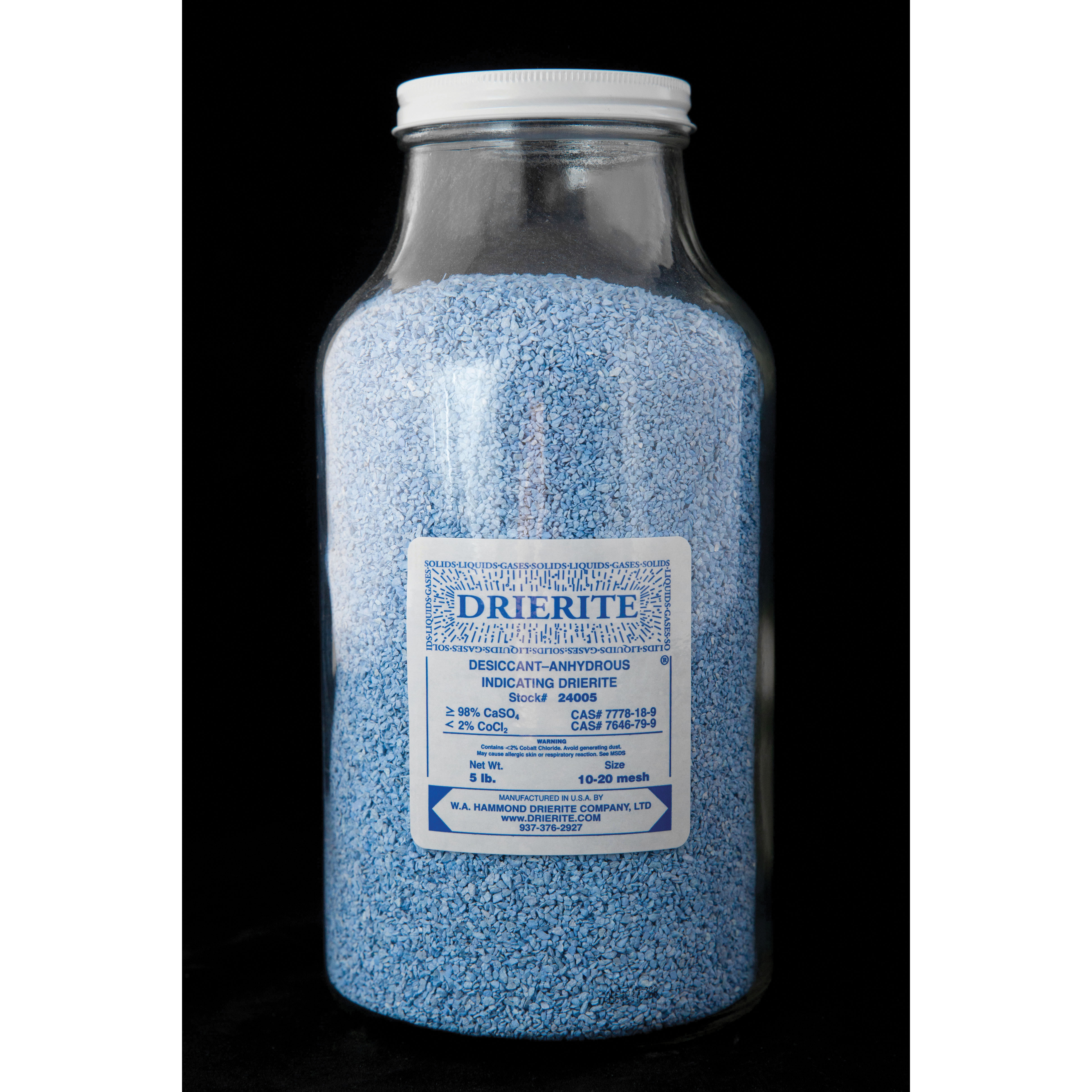 Drierite™ desiccants are made from the naturally occurring mineral, gypsum (calcium sulfate), and are available in several varieties designed to solve all types of drying problems. Drierite™ is an all purpose drying agent for the efficient and rapid drying of air, industrial gases, refrigerants, organic liquids and solids. It is used to maintain a dry atmosphere in storage spaces, vaults, commercial packages, and other enclosures; and for the protection of hygroscopic materials or materials subject to mildew, corrosion, rust, or other deterioration caused by high humidity. Indicating Drierite™ is impregnated with cobalt chloride. Indicating Drierite™ is blue when dry and changes to pink upon absorption of moisture. The color change is pronounced and clearly visible. This makes Indicating Drierite™ valuable when it is necessary to know with certainty that dryness is being maintained and to signal when the drying agent should be replaced. It has the same efficiency as Regular Drierite™, and somewhat greater capacity due to the desiccating effect of the cobalt chloride. It can be regenerated repeatedly for reuse.