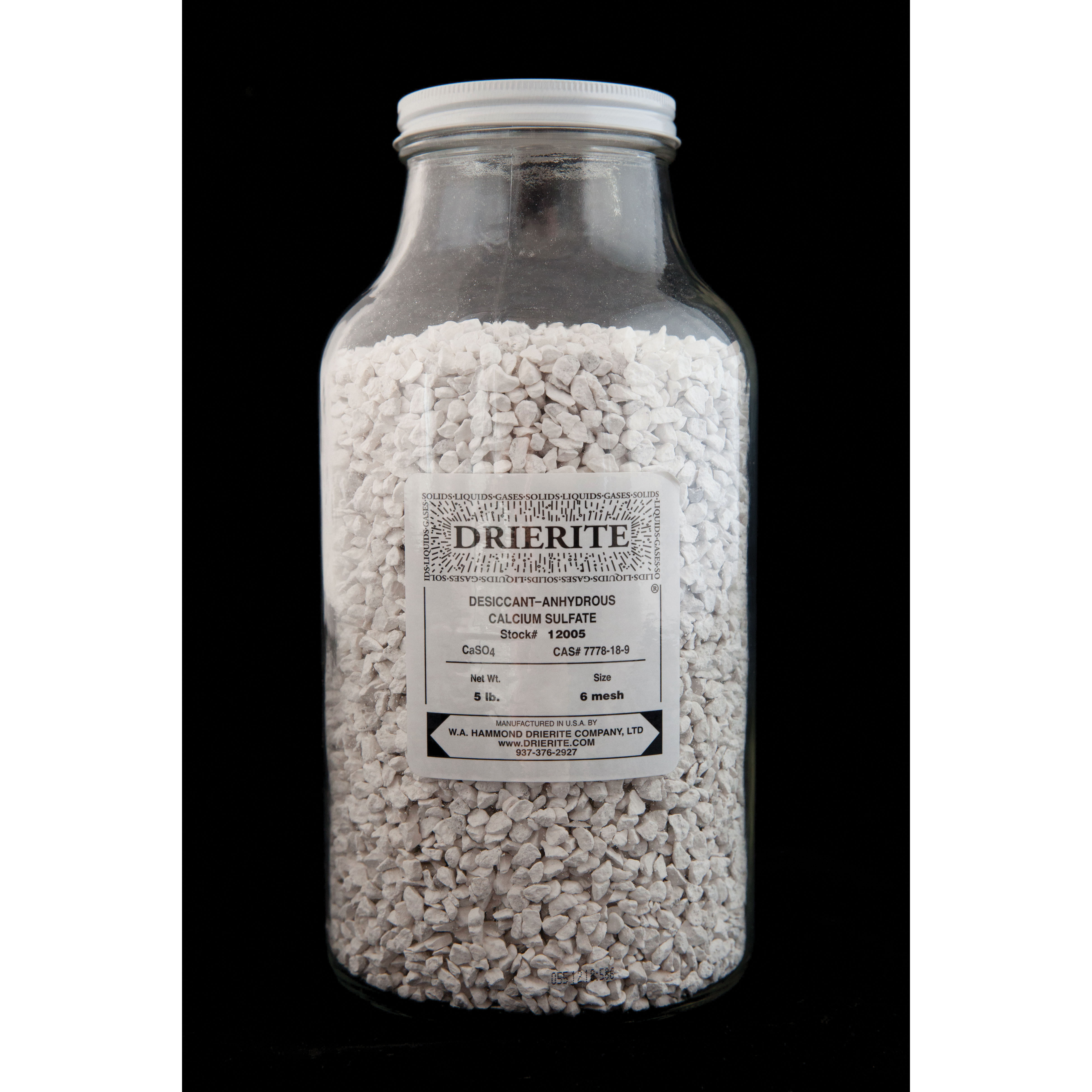 Drierite™ desiccants are made from the naturally occurring mineral, gypsum (calcium sulfate), and are available in several varieties designed to solve all types of drying problems. Drierite™ is an all purpose drying agent for the efficient and rapid drying of air, industrial gases, refrigerants, organic liquids and solids. It is used to maintain a dry atmosphere in storage spaces, vaults, commercial packages, and other enclosures; and for the protection of hygroscopic materials or materials subject to mildew, corrosion, rust, or other deterioration caused by high humidity. Regular Drierite™ is anhydrous calcium sulfate. It is of neutral pH, constant in volume, chemically inert except toward water, insoluble in organic liquids and refrigerants, non-disintegrating, non-wetting, non-toxic, non-corrosive, non-channeling, generally recognized as safe (GRAS) by the FDA, not regulated by OSHA, economical to use, and can be regenerated repeatedly for reuse.