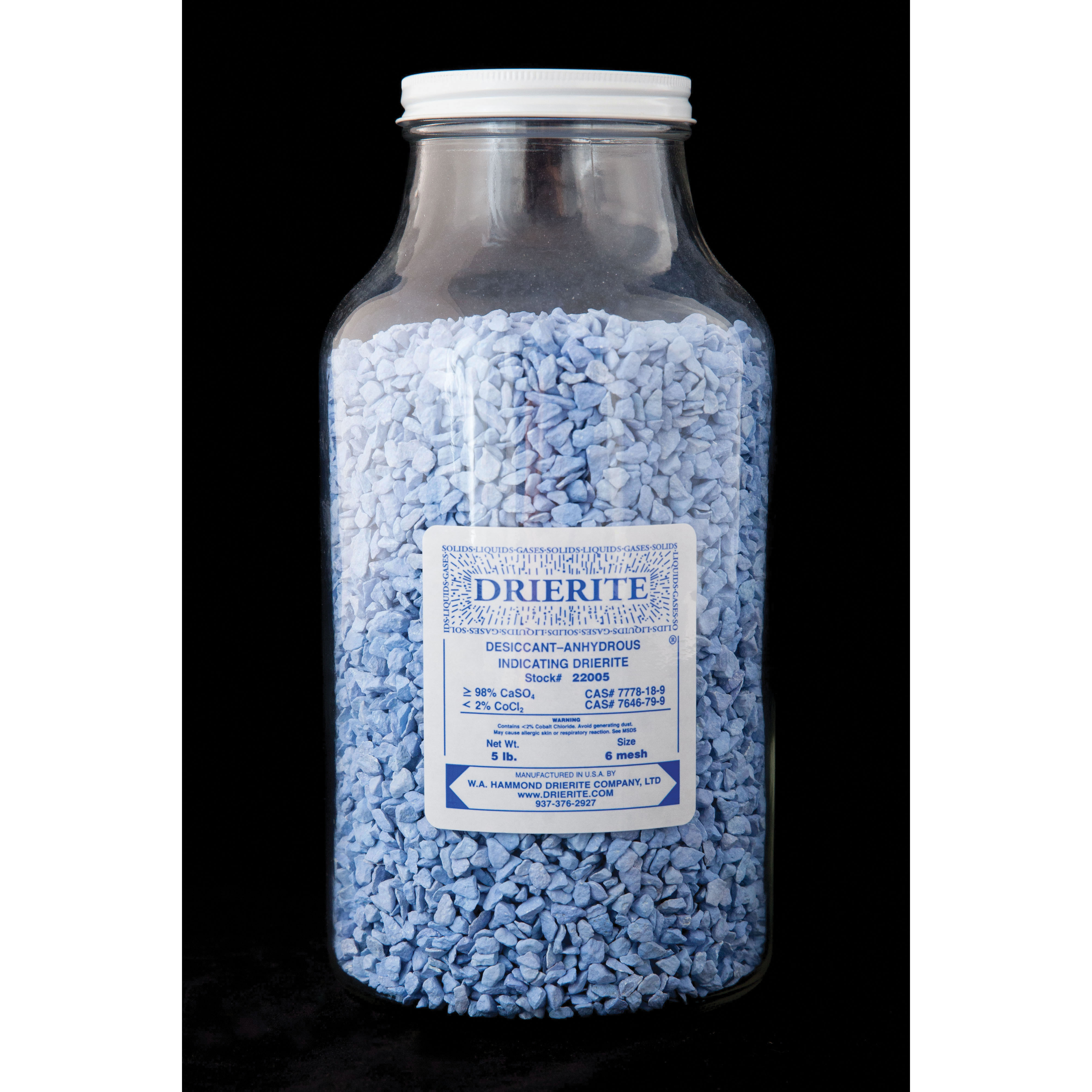 Drierite™ desiccants are made from the naturally occurring mineral, gypsum (calcium sulfate), and are available in several varieties designed to solve all types of drying problems. Drierite™ is an all purpose drying agent for the efficient and rapid drying of air, industrial gases, refrigerants, organic liquids and solids. It is used to maintain a dry atmosphere in storage spaces, vaults, commercial packages, and other enclosures; and for the protection of hygroscopic materials or materials subject to mildew, corrosion, rust, or other deterioration caused by high humidity. Indicating Drierite™ is impregnated with cobalt chloride. Indicating Drierite™ is blue when dry and changes to pink upon absorption of moisture. The color change is pronounced and clearly visible. This makes Indicating Drierite™ valuable when it is necessary to know with certainty that dryness is being maintained and to signal when the drying agent should be replaced. It has the same efficiency as Regular Drierite™, and somewhat greater capacity due to the desiccating effect of the cobalt chloride. It can be regenerated repeatedly for reuse.