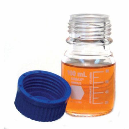 Media Bottle, 100 ml, 56 OD x 100 mm H, Clear, Borosilicate Glass, GL 45, Narrow Mouth, Blue Polypropylene Cap Material, 10 ml Graduation Interval, 20 to 80 ml Graduation Range, Autoclavable, Chemically Resistant, Graduations and Marking Spot