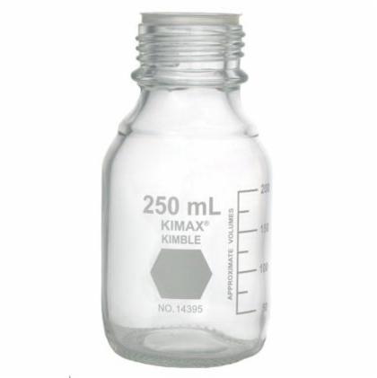Media Bottle, 250 ml, 70 OD x 138 mm H, Clear, Borosilicate Glass, GL 45, Narrow Mouth, 25 ml Graduation Interval, 50 to 200 ml Graduation Range, Autoclavable, Chemically Resistant, Graduations and Marking Spot