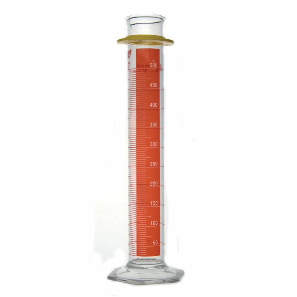 Cylinder, 500 ml, 375 mm H, Borosilicate Glass, ±2.6 ml Tolerance, 25 to 500 ml Graduation Range, 5 ml Graduation Intervals, Single Metric Scale, Red Stripe, Calibrated To Deliver, Class B