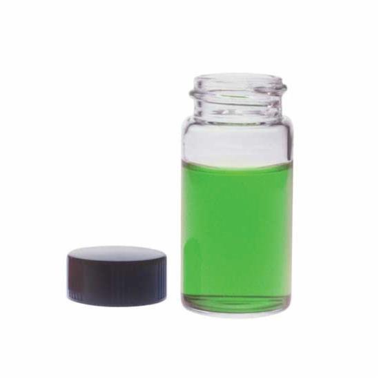 Sample Vial, 20 ml, 28 OD x 57 mm H, Clear, Borosilicate Glass, With Screw Thread Black Phenolic Caps and Rubber Liners, 24-400 Thread Finish, Cylindrical, Closed-Top Closure