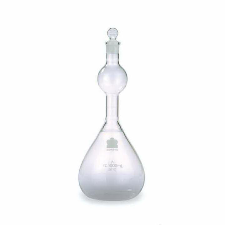 Wide mouths allow easy access into these mixing bulb volumetric flasks for applications such as dissolving tablets and other solids.