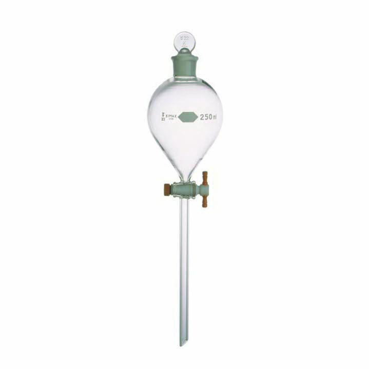 Separatory Funnel, 250 ml, Borosilicate Glass, 2 Standard Taper Stopcock, 22 Standard Taper Stopper, 175 mm Stem Length, Standard Taper Ground Glass Stopper and a PTFE Stopcock