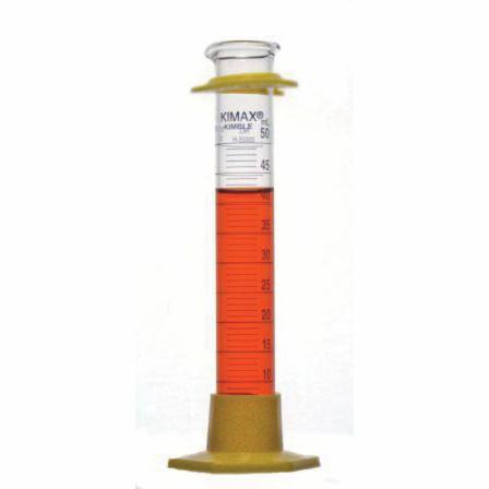 Cylinder, 50 ml, 185 mm H, Borosilicate Glass, 2 to 50 ml Graduation Range, 1 ml Graduation Intervals, Educational Grade, Plastic Base, Calibrated To Deliver, Single Blue Metric Scale, Class B, SAFE-GARD® Bumper