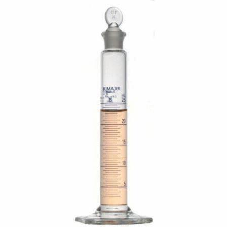 Cylinder, 25 ml, 160 mm H, Borosilicate Glass, ±0.3 ml Tolerance, 3 to 25 ml Graduation Range, 0.5 ml Graduation Intervals, 27 Standard Taper Stopper, Single Blue Metric Scale, Calibrated To Contain, Class B