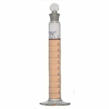 Cylinder, 50 ml, 195 mm H, Borosilicate Glass, ±0.4 ml Tolerance, 3 to 50 ml Graduation Range, 1 ml Graduation Intervals, 32 Standard Taper Stopper, Single Blue Metric Scale, Calibrated To Contain, Class B