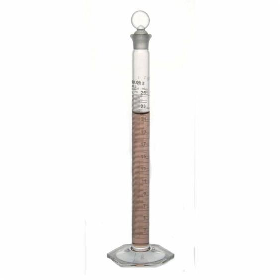 Mixing Cylinder, 25 ml, 215 mm H, Borosilicate Glass, 2 to 25 ml Graduation Range, 0.2 ml Graduation Intervals, ±0.14 ml Tolerance, 9 Standard Taper Stopper, Calibrated "To Contain", Class A, White Ceramic Enamel, Serialized and Certified