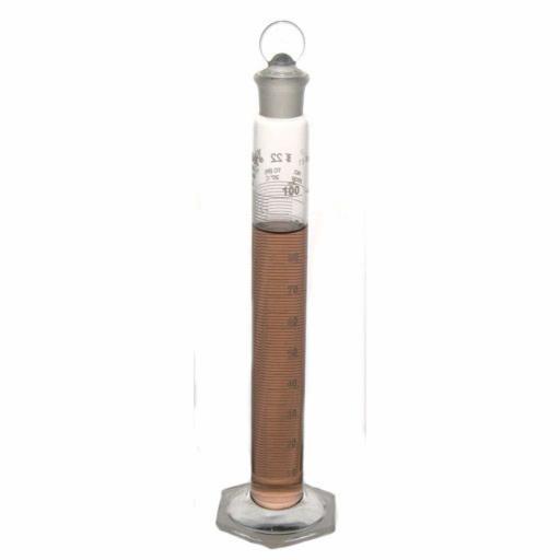 Mixing Cylinder, 100 ml, 255 mm H, Borosilicate Glass, 5 to 100 ml Graduation Range, 1 ml Graduation Intervals, ±0.35 ml Tolerance, 9 Standard Taper Stopper, Calibrated "To Contain", Class A, White Ceramic Enamel, Serialized and Certified