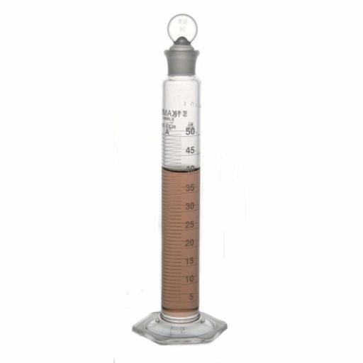 Mixing Cylinder, 250 ml, 330 mm H, Borosilicate Glass, 10 to 250 ml Graduation Range, 2 ml Graduation Intervals, ±0.65 ml Tolerance, 9 Standard Taper Stopper, Calibrated "To Contain", Class A, White Ceramic Enamel, Serialized and Certified