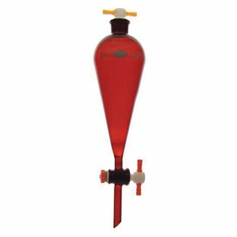 Separatory Funnel, 250 ml, Borosilicate Glass, 4 mm Stopcock Bore, 22 Standard Taper Stopper, Yellow Stopper, 60 mm Stem Length, Pear-shaped, Standard Taper PTFE Stopper and Color-coded PTFE Stopcock Plug