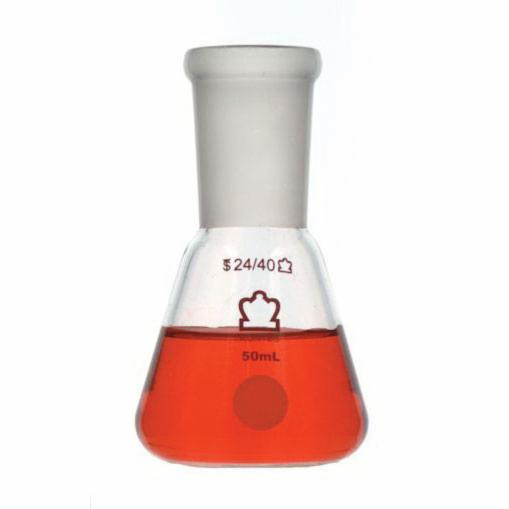 Erlenmeyer Flask, 50 ml, 90 mm H, Borosilicate Glass, Single Neck, 24/40 Standard Taper Joint, Jointed Narrow Mouth, Tops are Reinforced and Tooled with a Rounded Finish, Body is Thick-walled, With a Long Tapered Outside Contour