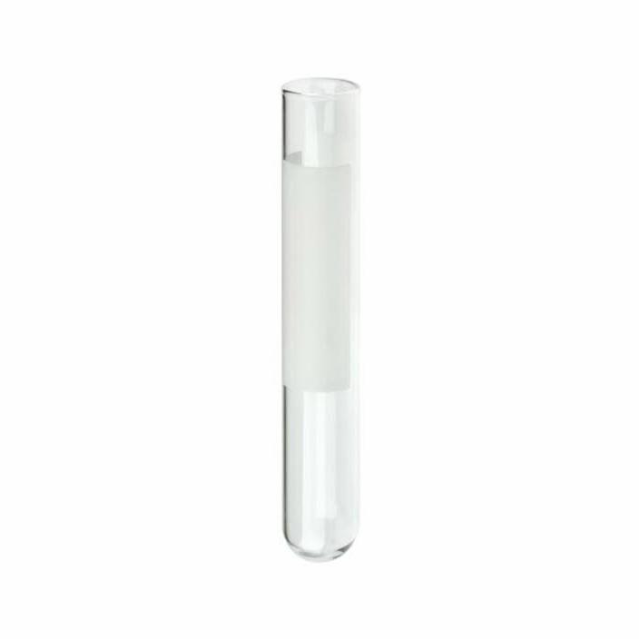 Culture Tube, 5 ml, 12 OD x 75 mm L, White, Borosilicate Glass, Disposable, With 1.375" Vertical Labels, Permanent Ceramic Labels are Located 0.75" From The Open End, Have Sturdy, Uniform Bottoms and Consistent Lengths