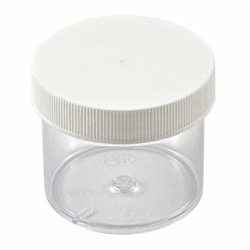 Container, 60 ml, 53 dia x 47 mm H, Clear, Polystyrene, Wide Mouth, Straight-Side Style, with White and Polypropylene Screw Closure, Lightweight, For Lab and Industry