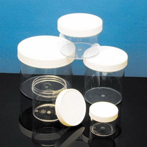Container, 180 ml, 70 dia x 72 mm H, Clear, Polystyrene, Wide Mouth, Straight-Side Style, with White and Polypropylene Screw Closure, Lightweight, For Lab and Industry
