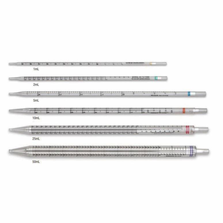Globe Scientific's plastic serological pipettes are produced under the strictest protocols and offer the highest degree of accuracy. The pipettes are supplied with an aerosol barrier plug that prevents both liquid and aerosols from contaminating the pipettors. The serological pipettes are produced from crystal clear polystyrene (PS) and are color coded for easy volume identification. Available in 1 ml, 2 ml, 5 ml, 10 ml, 25 ml and 50 ml sizes.