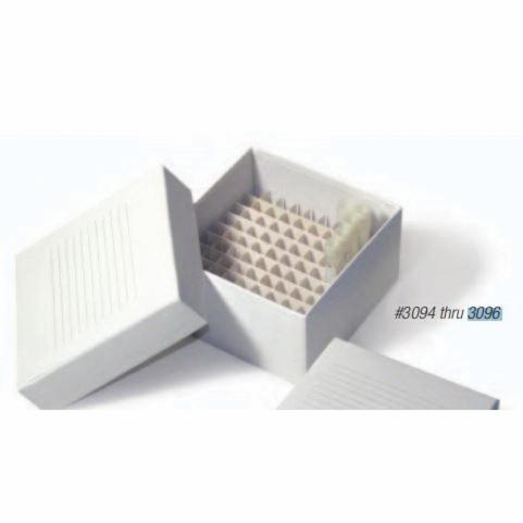 Cryogenic Storage Box, 134 x 134 x 76 mm, White, Cardboard, 100 Place (10 x 10) Format, With Dividers, Liquid Resistant Coating, Numbered Grid, Drainage Holes Eliminate Liquid, For up to 3" Tall x 12 mm Wide Tubes