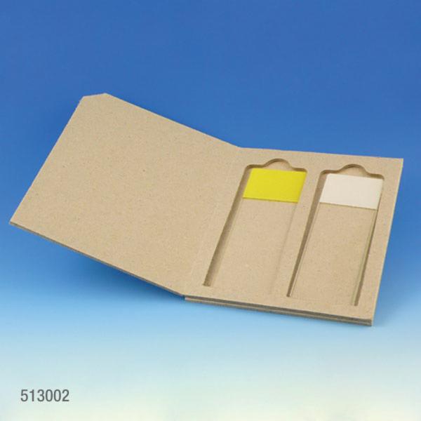 The flat cardboard slide mailers securely hold slides with or without a cover-glass. They feature an inner finger groove for effortless slide removal along with a cover that opens for viewing. The flat surface area is ideal for labeling or writing any necessary information. They are light-weight and reusable to minimize cost. The 20-place cardboard slide holder contains a numerical index that corresponds to the inner slide compartments. The inside flaps are recessed so that there is no contact or contamination between the slides and the cover when closed. With a 360° hinge, the cover folds flat underneath to save space when the holder is in use.