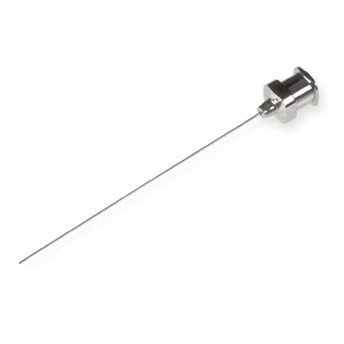 The metal hub is made from nickel plated brass. Needles are available from 33 to 10 gauge. This hub makes the most rigid connection to the needle making it perfect for repetitive septum piercing. Metal hub needles are compatible with PTFE luer lock (TLL) syringes. All needles are sold in six-packs and the standard needles are 51 mm long.