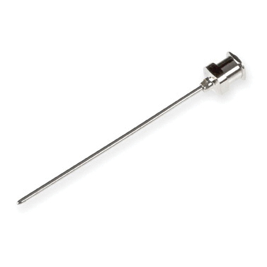 The metal hub is made from nickel plated brass. Needles are available from 33 to 10 gauge. This hub makes the most rigid connection to the needle making it perfect for repetitive septum piercing. Metal hub needles are compatible with PTFE luer lock (TLL) syringes. All needles are sold in six-packs and the standard needles are 51 mm long.