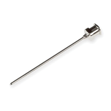 The metal hub is made from nickel plated brass. Needles are available from 33 to 10 gauge. This hub makes the most rigid connection to the needle making it perfect for repetitive septum piercing. Metal hub needles are compatible with PTFE luer lock (TLL) syringes. All needles are sold in six-packs and the standard needles are 51 mm long.