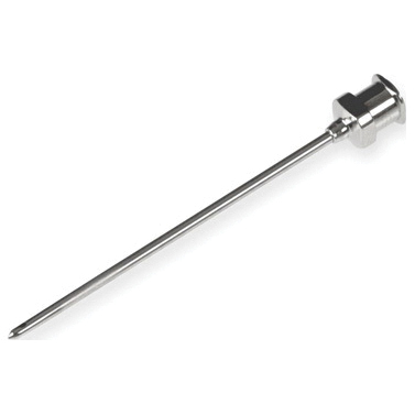 The metal hub is made from nickel plated brass. Needles are available from 33 to 10 gauge. This hub makes the most rigid connection to the needle making it perfect for repetitive septum piercing. Metal hub needles are compatible with PTFE luer lock (TLL) syringes. All needles are sold in six-packs and the standard needles are 51 mm long.