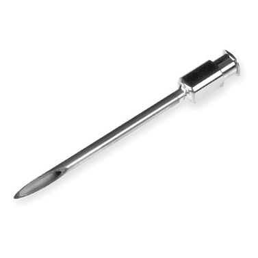 Luer Lock Needle, 51 mm L, 2.39 ID x 3.05 mm OD, 304 Stainless Steel, 11 ga, Sharp, Bevel, Curved, Non-coring 2 Point Style, Nickel Plated Brass Standard Metal Hub, Autoclavable, For Gas Chromatography (GC), Septum Piercing