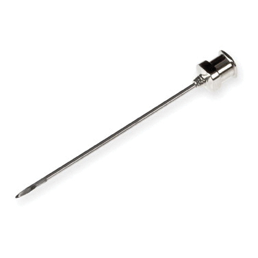 The metal hub is made from nickel plated brass. Needles are available from 33 to 10 gauge. This hub makes the most rigid connection to the needle making it perfect for repetitive septum piercing. Metal hub needles are compatible with PTFE luer lock (TLL) syringes. All needles are sold in six-packs and the standard needles are 51 mm long.