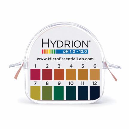 1 to 12 Hydrion Double Roll pH Papers consist of two rolls of pH papers packaged in a protective plastic dispenser with stainless steel cutoff lips and two matching color charts. pH color changes are distinct and easily matched to the color chart. Hydrion Double Roll pH Wide Range Papers have a clear color match at each full pH unit:[1.0][2.0][3.0][4.0][5.0][6.0][7.0][8.0][9.0][10.0][11.0][12.0].
